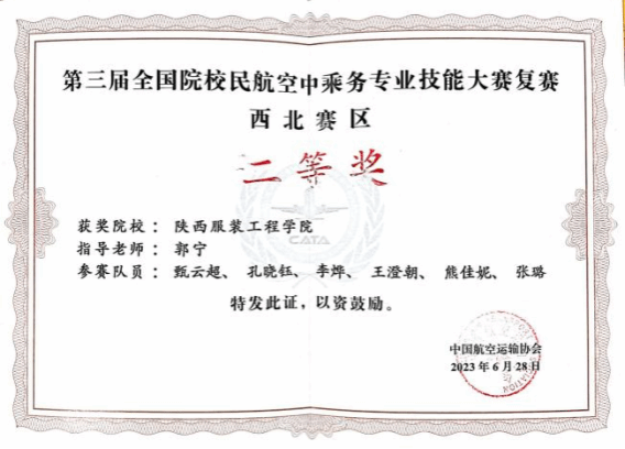 我校空中乘务专业在2021年首届民航院校空中乘务职业技能大赛中荣获团体三等奖。我校空中乘务专业在2023年第三届民航院校空中乘务职业技能大赛中荣获团体二等奖。